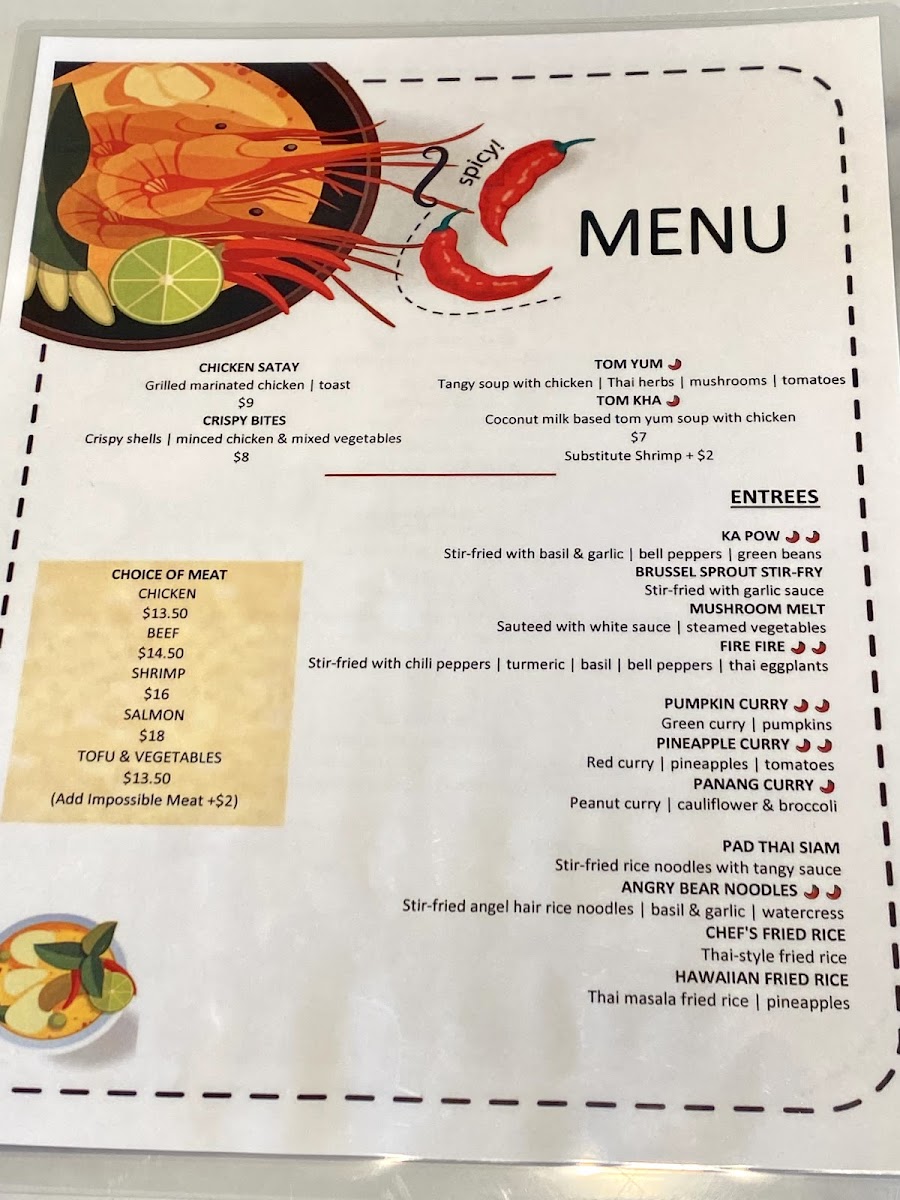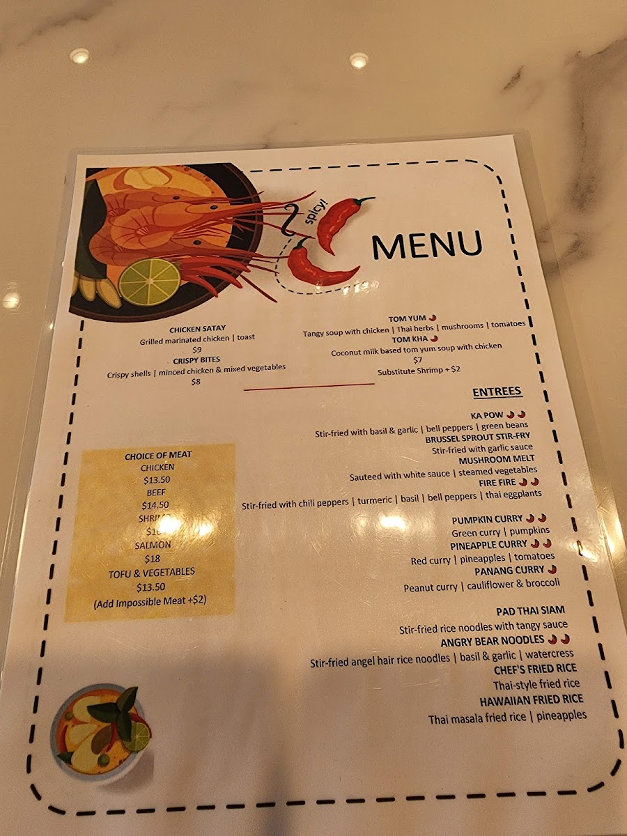 “ To start the entire staff was warm, friendly and welcoming without being overbearing. The entire restaurant is vibrant, with an easy chill feel. The food was amazing. Gf ordered the pumpkin curry, I believe I ordered the angry bull noodles with chicken. The portions were great had enough for leftovers for another meal. The flavor and spice level were fantastic I love spicy food and got three level spice might need to get four level next time. We also ordered the mango sticky rice. It was superb. Flavorful and not too sweet. Definitely our new favorite Thai restaurant hands down. ”